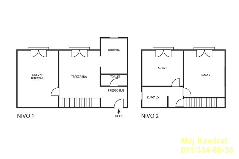 Na prvom nivou nalazi se predsoblje, mali mokri čvor, odvojena kuhinja sa prirodnom ventilacijom, trpezarija i prostran dnevni boravak. Na drugom nivou nalaze se dve komforne spavaće sobe i kupatilo.